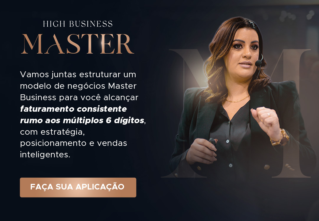 Hoje eu lidero o High Business Master, um programa de aceleração que ajudam empresárias e mentoras a lucrarem com posicionamento, processos de vendas eficientes e uma estrutura leve, sem depender de sorte ou fórmula mágica.
